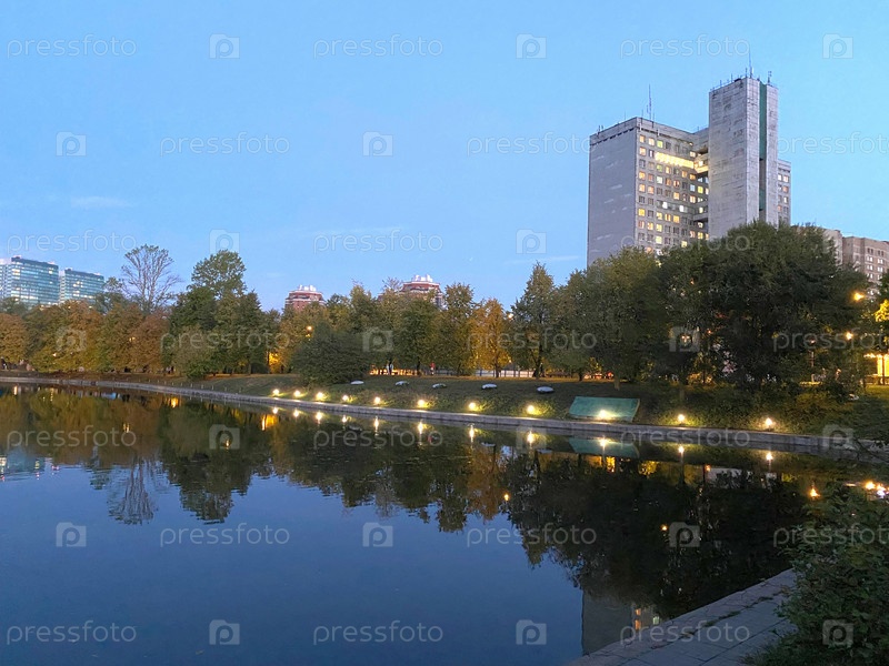 Лето в городском парке вечером с светодиодными огнями на побережье