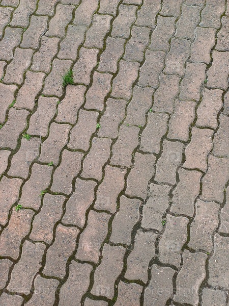 Текстура старого мощеного камня с зелеными насаждениями, заглядывающими сквозь трещины в тихой внешней обстановке