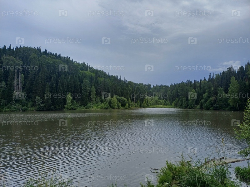 Озеро Серена окружено пышным лесом под облачным небом в спокойной природной обстановке
