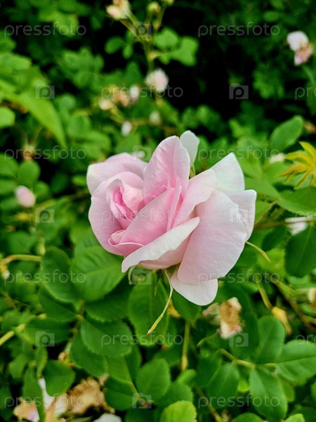 Красивая розовая роза, цветущая в пышном зеленом листье, запечатлена солнечным днем в саду