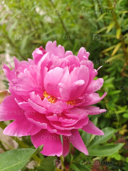 Красивый розовый цветок пионниц цветёт в ярком саду весной с пышной зеленой на заднем плане