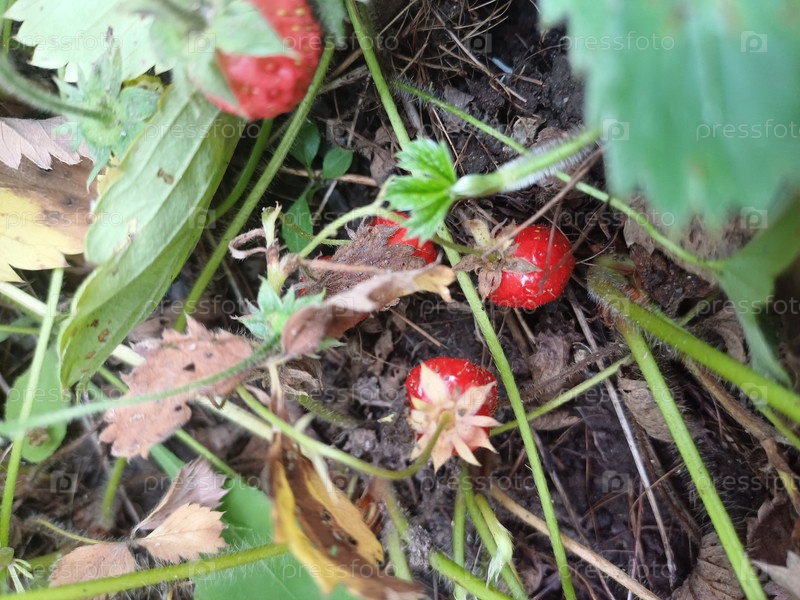 Зрелые клубники растут в саду, окруженном зелеными листьями и почвой во время летнего сезона