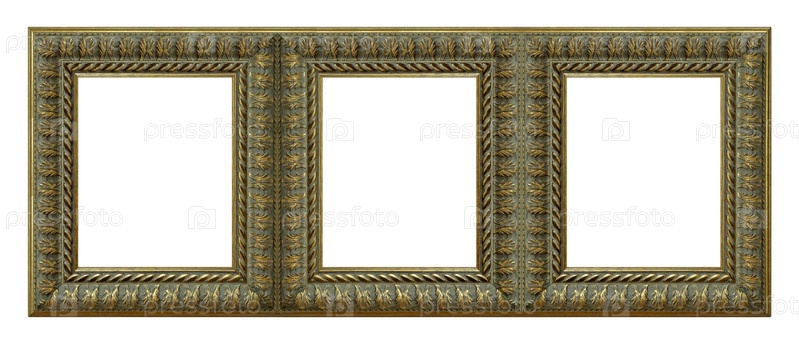 Тройная золотая рама (триптих) для картин, зеркал или фотографий, изолированных на белом фоне