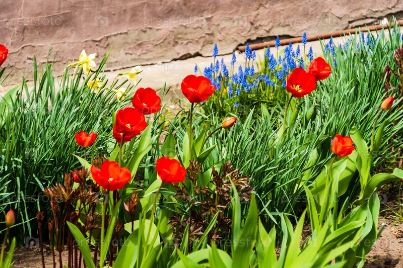 Городской пейзаж. тюльпаны на клумбе. воронеж