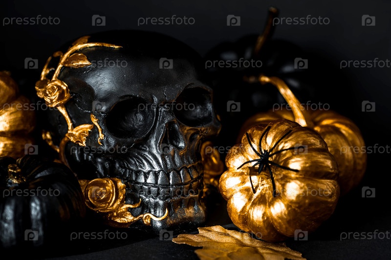 Черный череп с золотыми розами, тыквами и черными свечами. Декорация на День мертвых или Хэллоуин на чёрном фоне