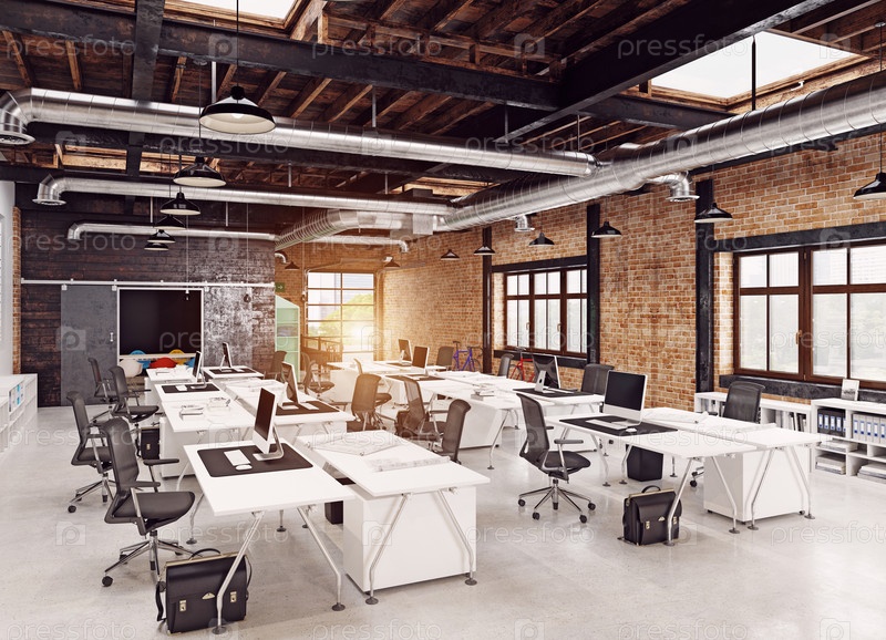 Открытый офисный план со столами и эргономичными стульями. 3D-рендеринг