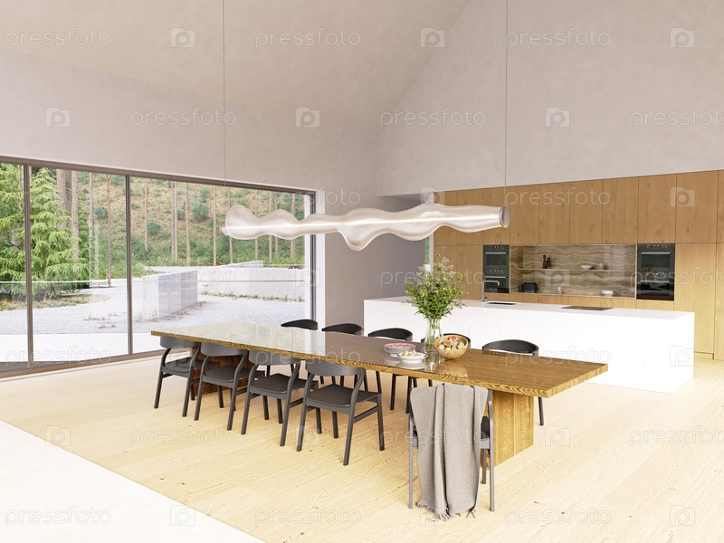 Лофт-план с просторной столовой и кухней с естественным освещением и деревянными деталями. Modern Luxury Home Interior 3D Open Real Estate Rendering