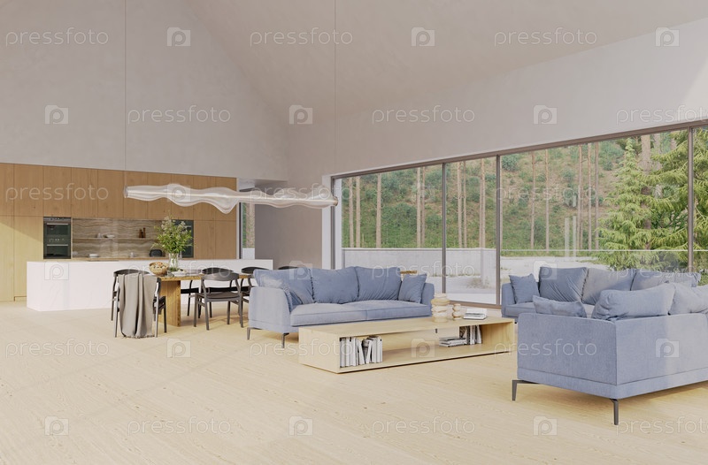 Современная открытая гостиная с голубыми диванами и кухней с видом на лес.Современный дизайн интерьера дома, 3D-рендеринг