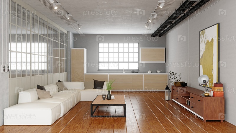 Индустриальная современная гостиная лофт и кухонный интерьер с бетонными стенами, деревянным полом и большим белым диваном. 3D-рендеринг для недвижимости