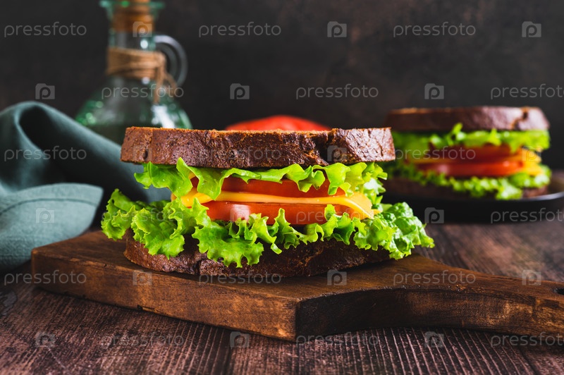 Вегетарианский бутерброд с помидорами, сыром и салатами на борту на столе