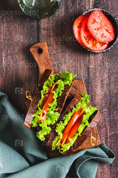 Легкий бутерброд с овощами и сыром на ржаном хлебе на доске наверху и с вертикальным видом
