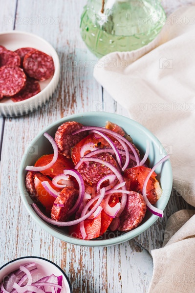 Салат с колбасой Chorizo, помидоры и лук на тарелке на столе вертикальный вид