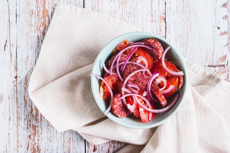 Покройте вкусный салат с хоризо, помидорами и красным луком в чашечке вид сверху