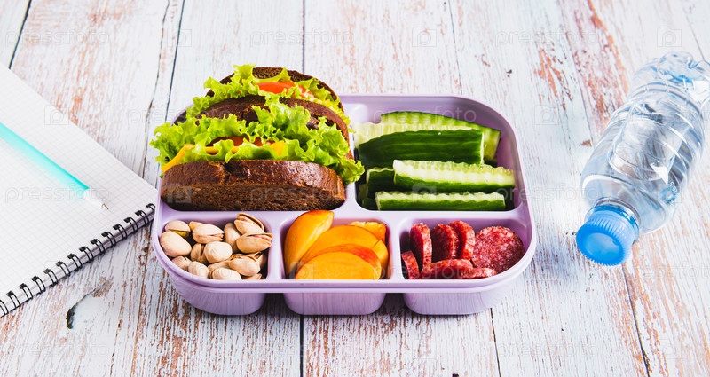 Обеденный ящик с едой, бутылкой воды, ноутбуком и ручкой на столе веб-баннер