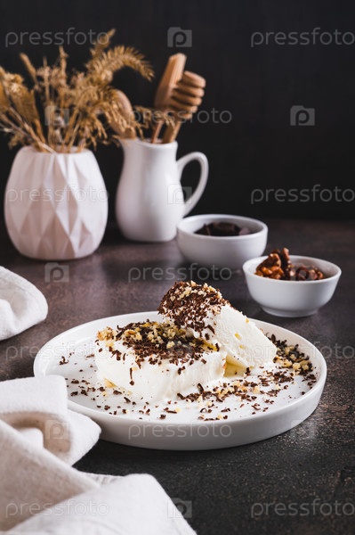 Мороженое, посыпанное шоколадными чипсами и орехами на тарелке на вертикальном столе