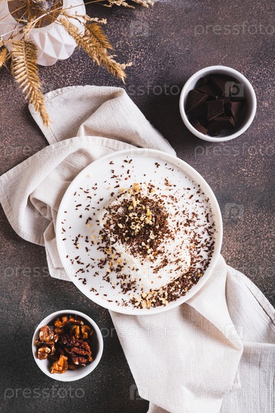 Бар мороженого с шоколадом и орехами на тарелке на столе и с вертикальным видением
