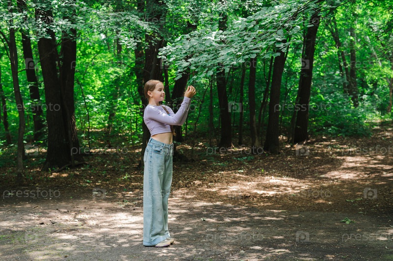 Девочка-подросток смотрит на листья в ветке дерева в парке