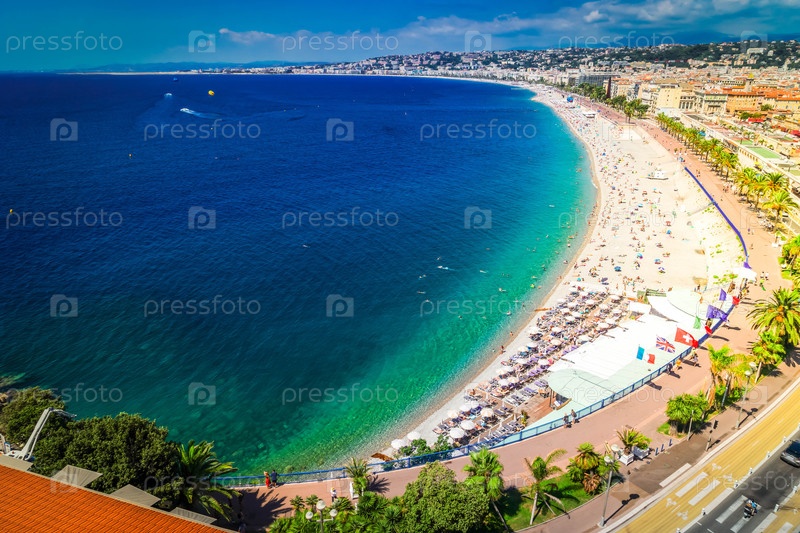 Пляж и турецкие воды побережья Лазурного берега в Ницце, Ривьера, Франция