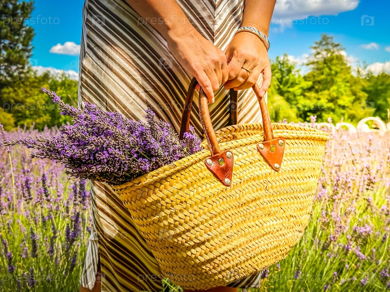 Красивая стильная корзина, наполненная ароматной лавандой, расположена в ярком поле, идеально подходит для цветочных рисунков