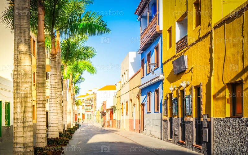 Уютная улица с пальмами в Пуэрто-де-ла-Крус, Тенерифе Испания