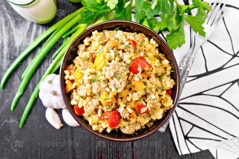 Жемчужная каша с фаршированным мясом в миске на доске наверху