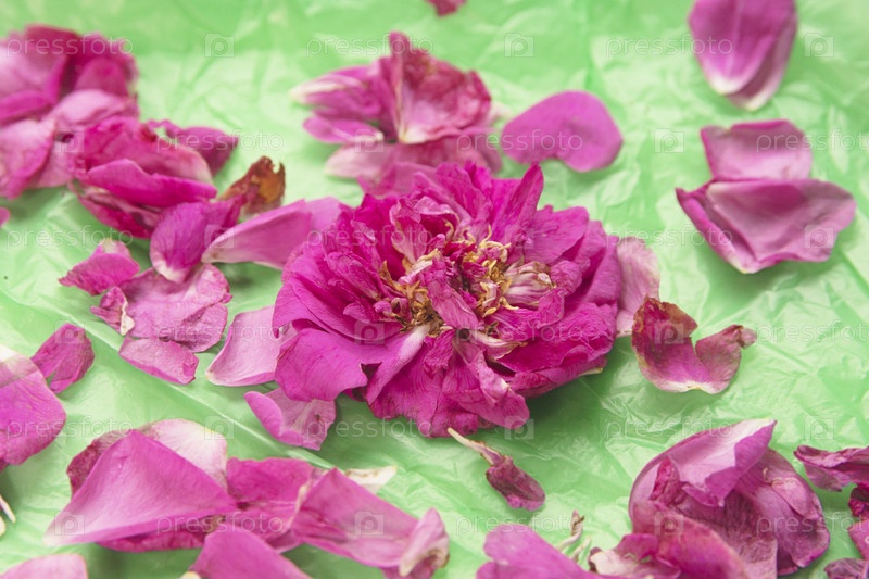 Падающие лепестки роз и цветы тазобедренного сустава на зеленом пластиковом фоне