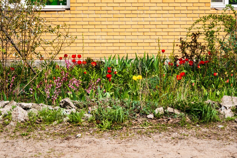 Городской пейзаж. тюльпаны на клумбе. воронеж