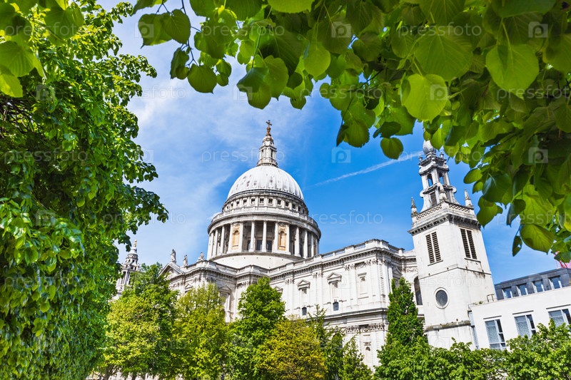 Собор Святого Павла в Лондоне, обрамленный пышными летними листьями под чистым голубым небом, Англия