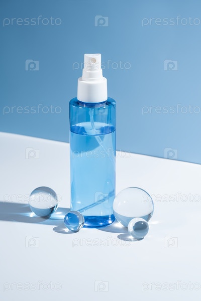 Увлажняющая мутная бутылка для лица на успокаивающем синем фоне, захватывающая свежесть спа-салона. Идеально подходит для контента самообслуживания и органического маркетинга по уходу за кожей