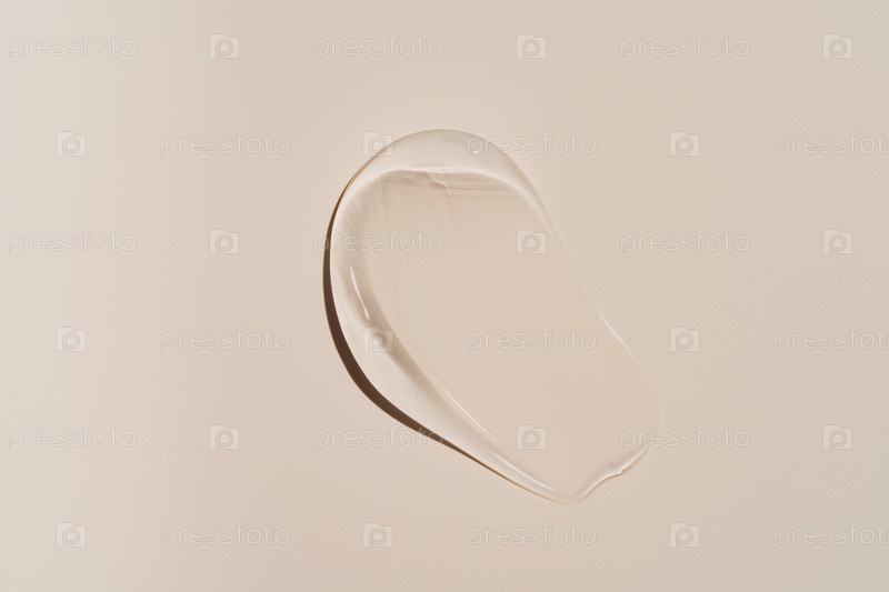 Чистый прозрачный косметический гель на бежевом фоне, текстура глицерина для ухода за кожей. Вид сверху. Пространство для текста