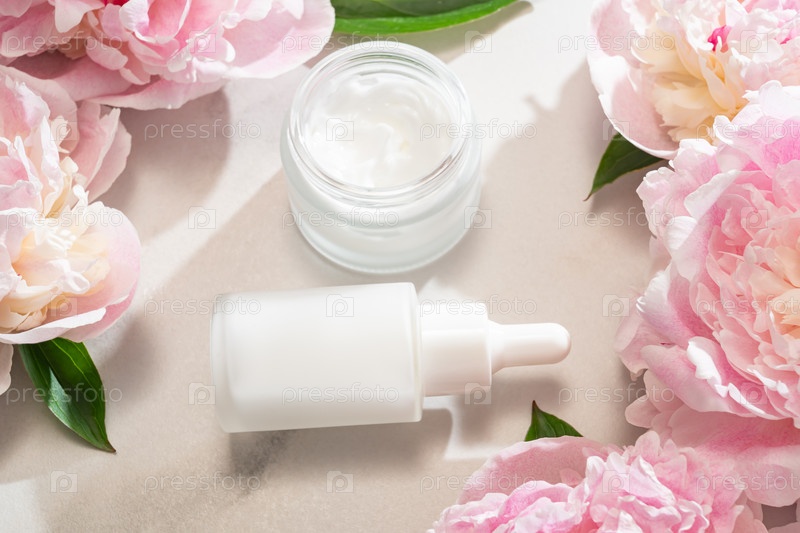 Дисплей продуктов по уходу за кожей с кремовой банкой, бутылкой сывороточной и пионным акцентом, идеально подходит для визуальных изображений электронной коммерции, каталогов магазинов красоты и контента витрины продукта