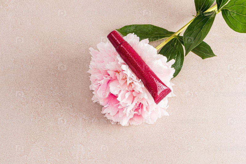 Безымянная трубка с косметикой лежит на большом великолепном розовом цвету пионки. бежевый каменный фон. копия пространства. плоская труба