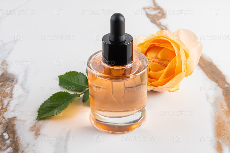 Стеклянная бутылка с натуральным уходом за лицом и кожей на фоне мраморной абстрактной чайной розы. Пустая компоновка бутылки. Естественный органический уход