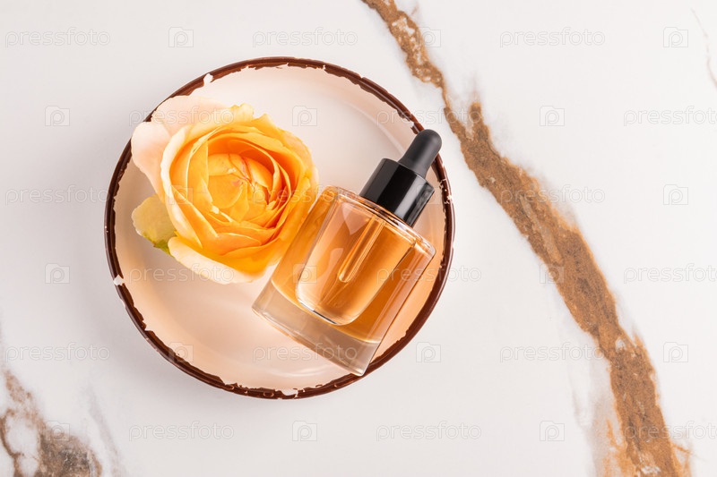 Шикарная бутылка с капельницей продукта по уходу за красотой лежит на тарелке с розовой головкой и мраморным абстрактным фоном. натуральная косметика