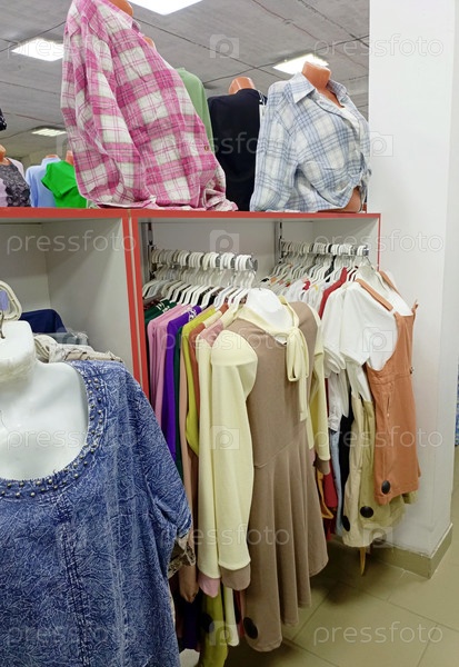 Поставка женской одежды с пастельными топами и платьями в магазине, представляющем моду и шопинг