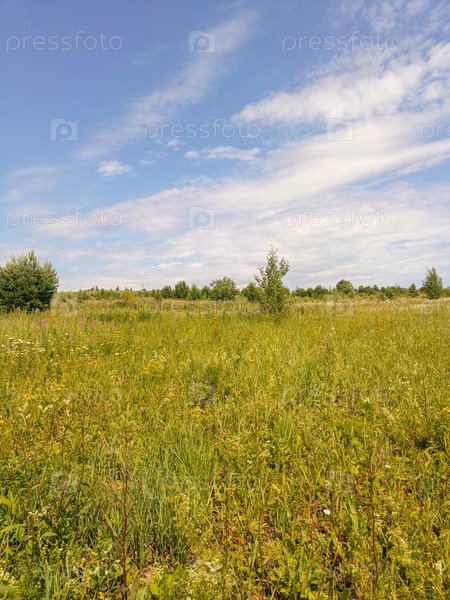 Летняя луга в живописном стиле, в зеленых и желтых цветах, представляющая красоту и спокойствие природы с скопированным пространством
