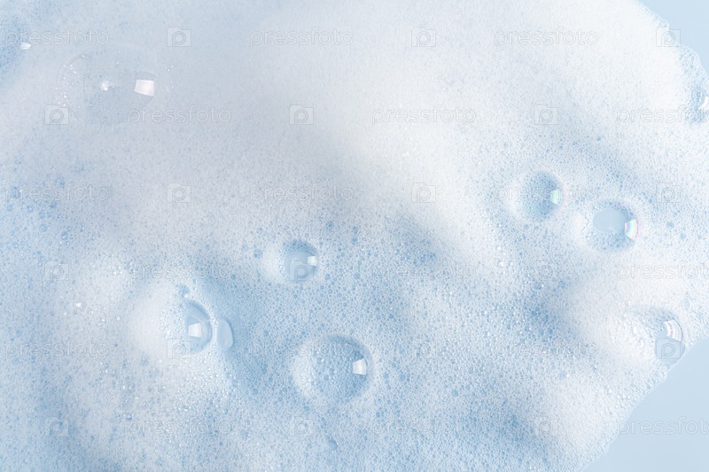 Абстрактная текстура фона белой мыльной пены. Шампунь, гель для душевых пузырей. Нежный сине-белый косметический фон
