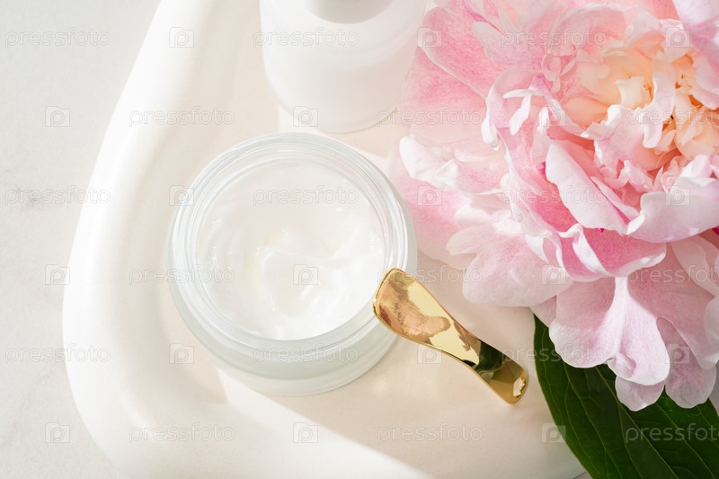 Бутылка для капель сыворотки молока и банка с кремом на бетонной подносе с розовыми пиониками