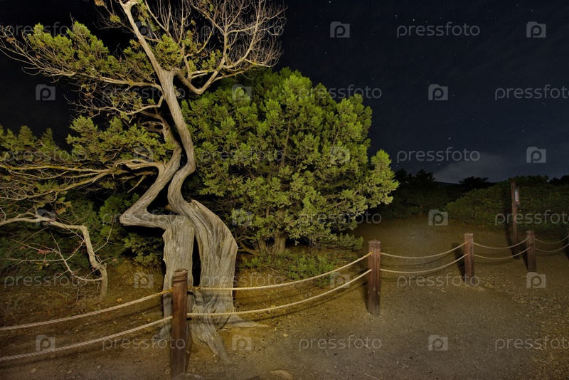 Странные кривые реликтных березовых деревьев на ночных скалах Черного моря у мыса Капчик на Крымском полуострове