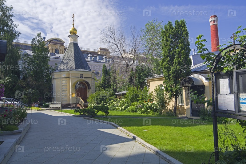 Часовня Проявления Господнего во дворе церкви Николая Чудотворца в колокольчиках.Руг Звонарского переулка и Рождественской улицы, Москва.Солнечный день в июле
