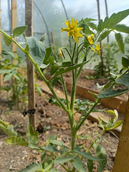Растение томата с желтыми цветами в теплице, представляющее собой домашнее садоводство и органическую пищу