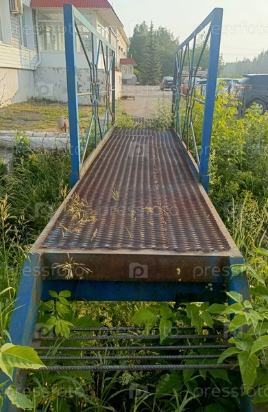 Ржавая тропа с голубыми перилами в заброшенном стиле, представляющая собой оставление и восстановление природы