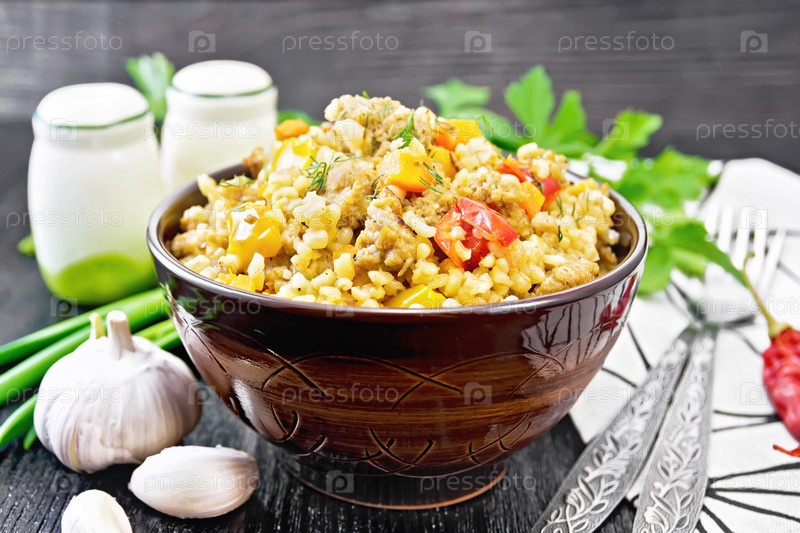Жемчужная каша с измельченной в миске на борту