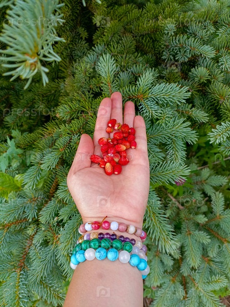 Рука с браслетами в нежной позе купается дикие клубники против пышной зелени, представляющей богемное лето