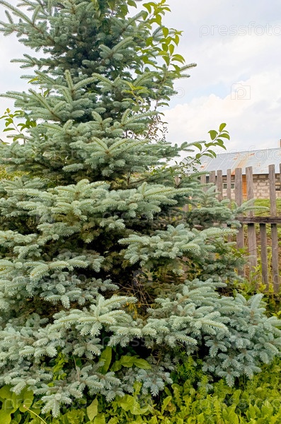 Голубое дерево в саду в сине-зеленых цветах, представляющих хвойные растения и ландшафтный дизайн