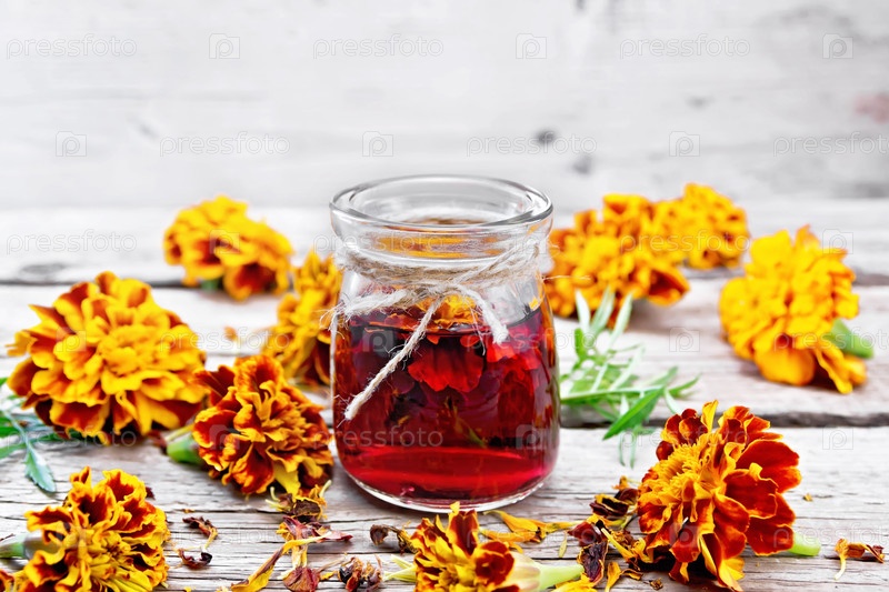 Тинктура алкоголя из бархатных тканей в банке на старой доске