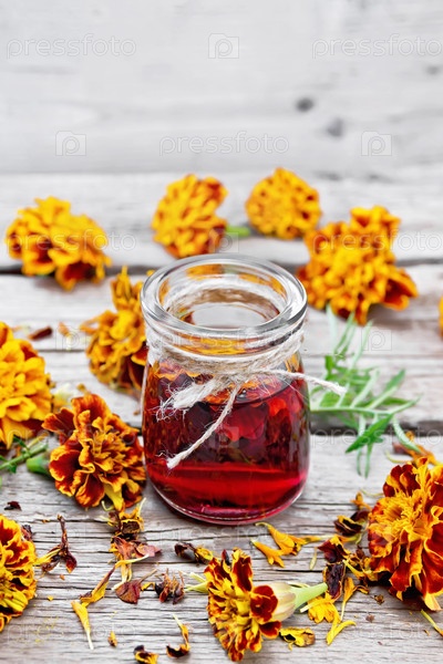Тинктура алкоголя из бархатных тканей в банке на старой деревянной доске