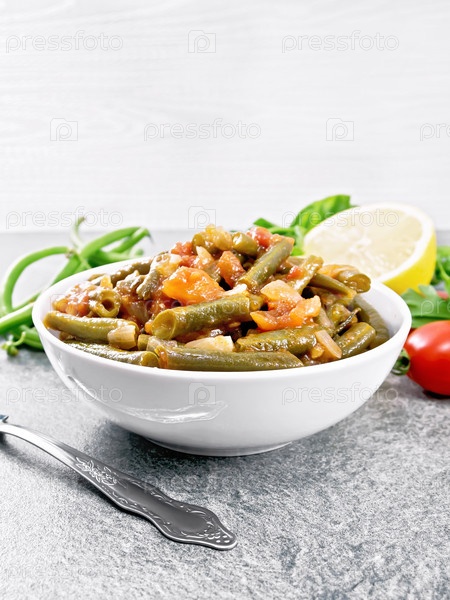 Зеленые бобы с овощами в миске на граните