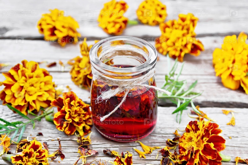Тинктура алкоголя из бархатных тканей в банке на деревянной доске