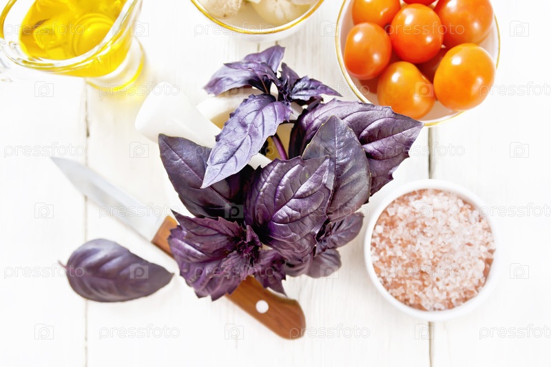 Фиолетовый базилик в растворе на доске сверху